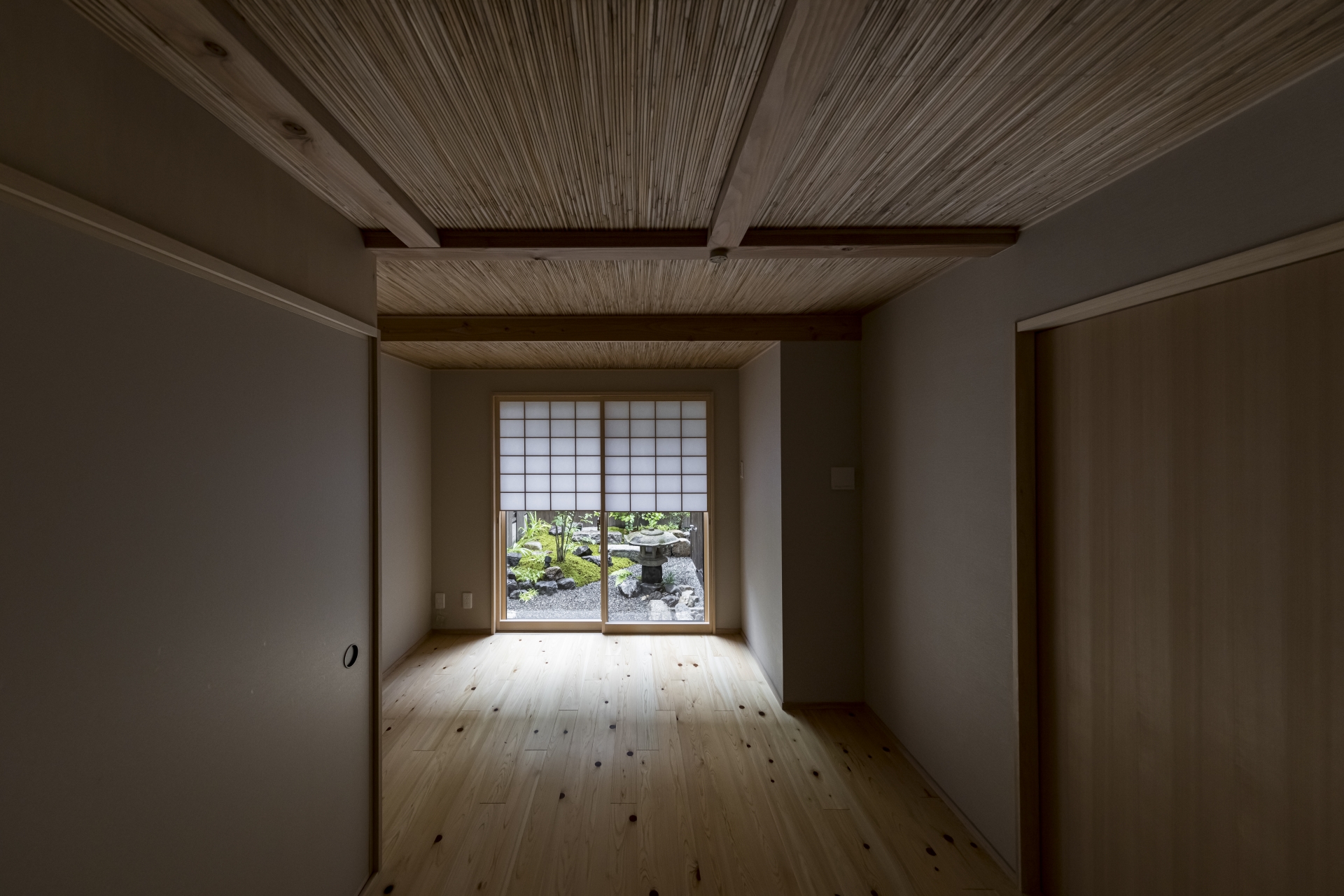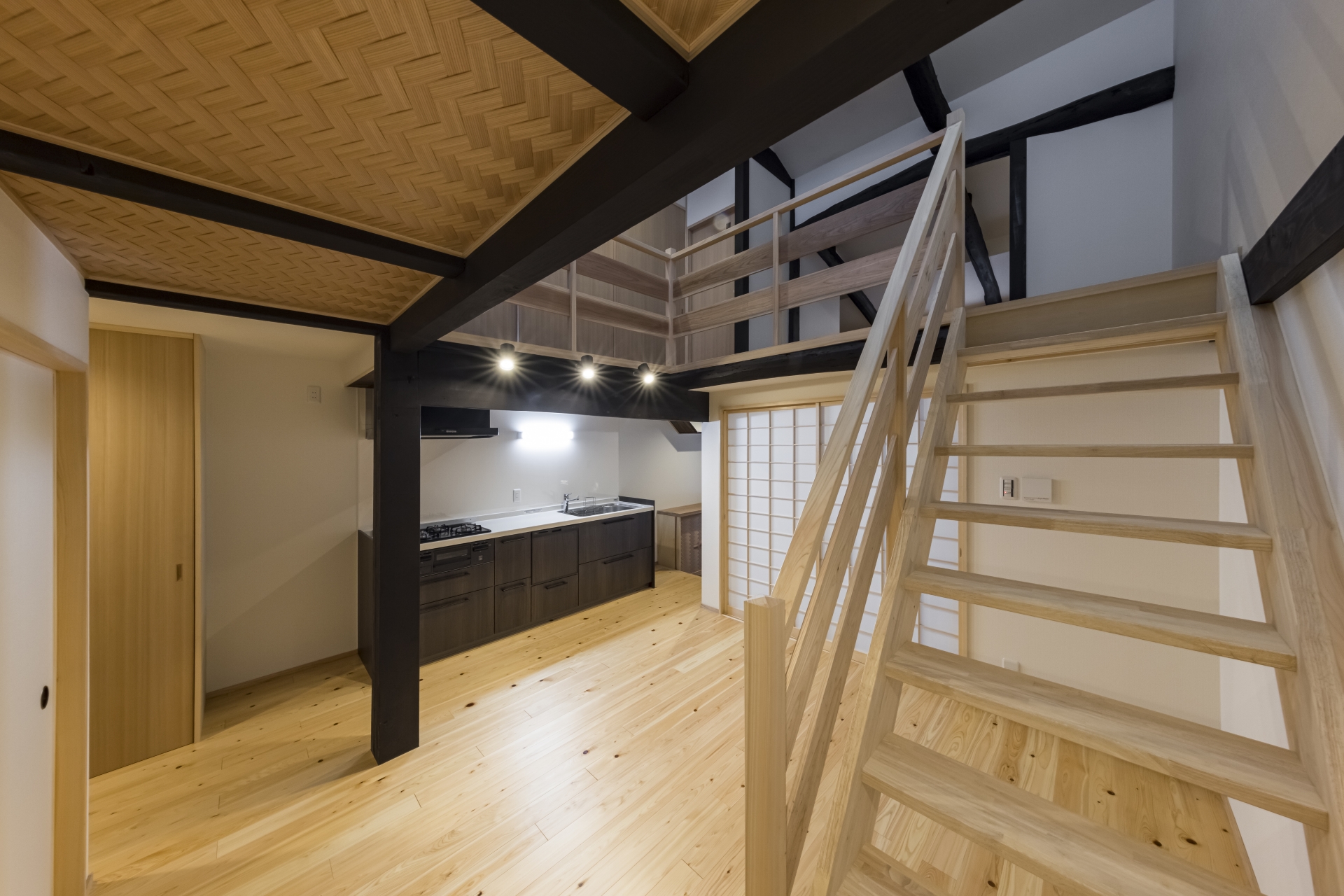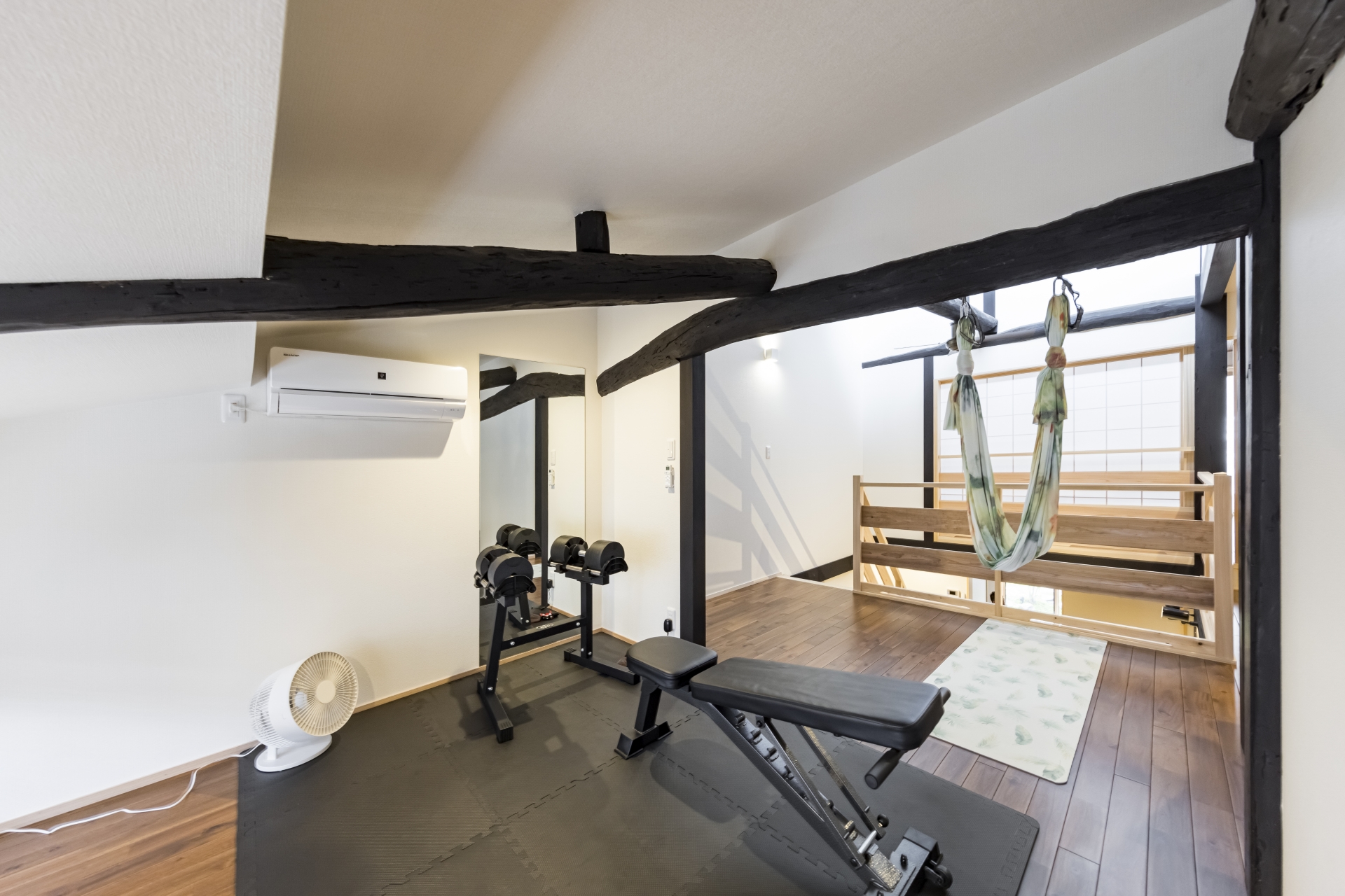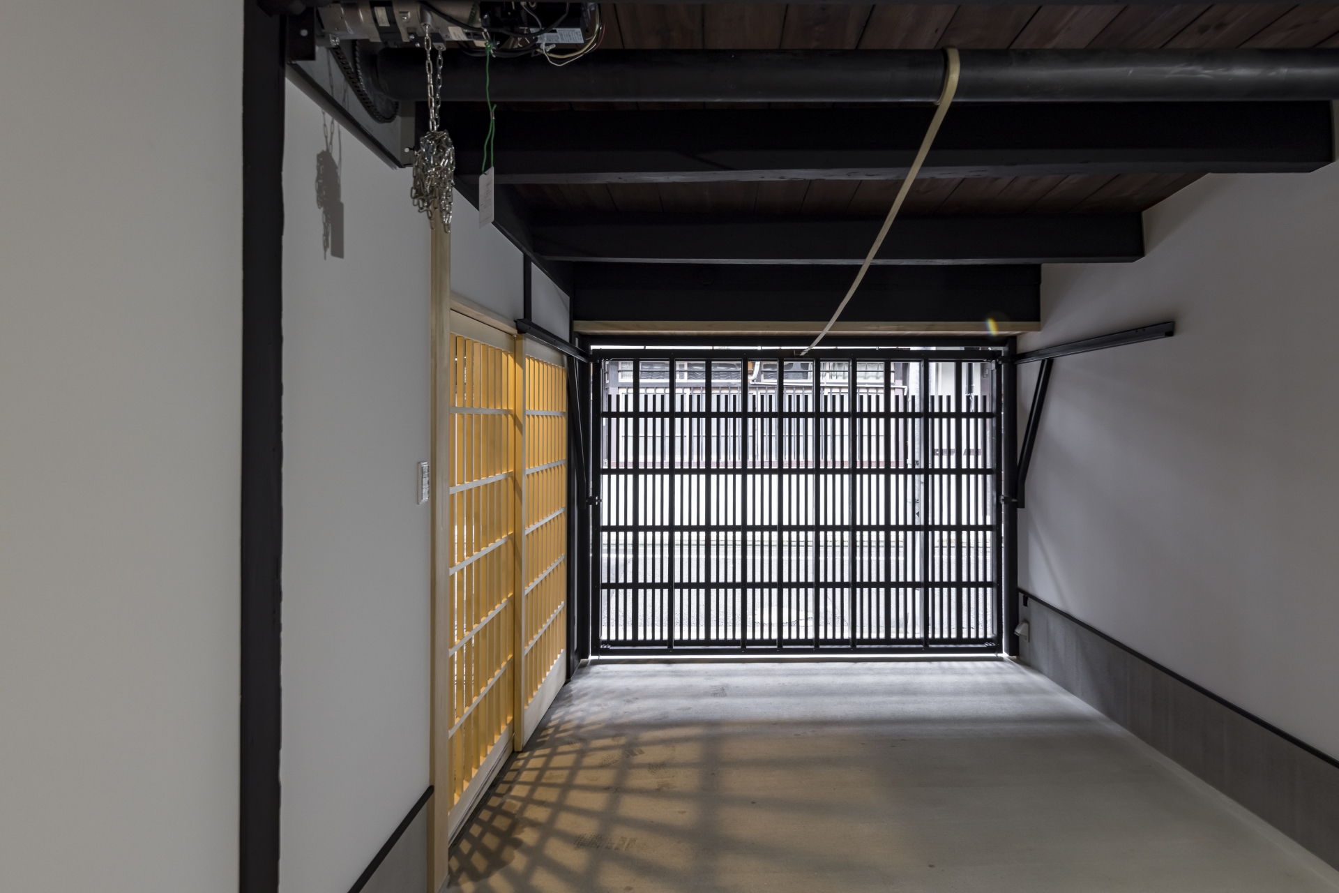 骨組みが見える解体し、配管の見直し、建物の歪みも検査しました。部屋数も少なくし吹き抜けを採用。風通しや彩光にも配慮した京町家へ。リビングや玄関からそのまま移動できるインナガレージも格子でかっこよく。京都の景観を損なわない外観へ。厨子二階を上手く利用しトレーニングルームにしました
